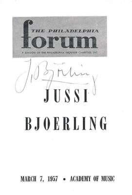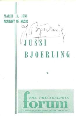 Programs Signed. Bjoerling, J(ussi). Philadelphia, Academy of Music, March 14, 1956; March 7, 1957 (2). 8vo, orig. self-wrappers. 2 signed in black ink, 1 in blue-green ink by Bjoerling. All Philadelphia forum issues. Clean, signatures clear.
