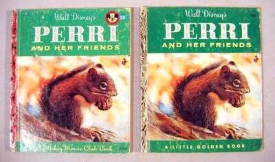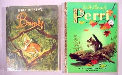Disney Studios: Walt Disney's Bambi. New York: Simon and Schuster, (1941). First Disney edition. 4to, orig. color pictorial glazed bds.; faint horizontal crease, d/j (minor edge wear). Color illus. Complete with the four "Bambi Gallery" color plates. Internally clean.* Walt Disney's Perri and Her Friends. New York: Simon & Schuster, (1956). First Disney edition. Mickey Mouse Club Book no. 54. 8vo, orig. color pictorial bds; edge wear. Color illus. * The Little Golden Book of the preceding, New York: Simon & Schuster, (1956). 8vo, orig. color pictorial bds.; moderate wear. Color illus. * The Big Golden Book issue of the preceding, New York: Golden Press, (1957). 4to, orig. color pictorial glazed bds; light wear. Color illus.