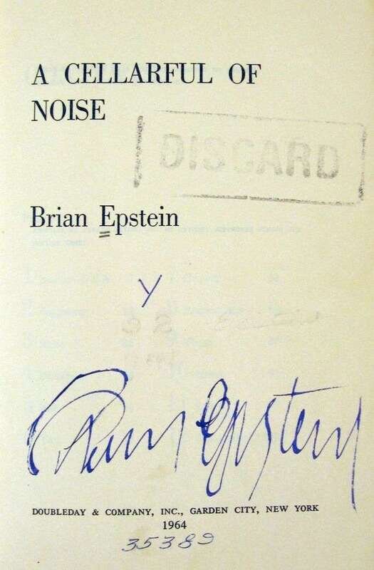 (Autograph Material.) Epstein, Brian. A Cellarful of Noise. Garden City, 1964. First edition. 8vo, orig. cloth, d/j (some edge wear, adhering to cloth). Hinges tender. Photo plates. Ex-library copy - markings on title page & endpaper. Signed by Brian Epstein on title page.