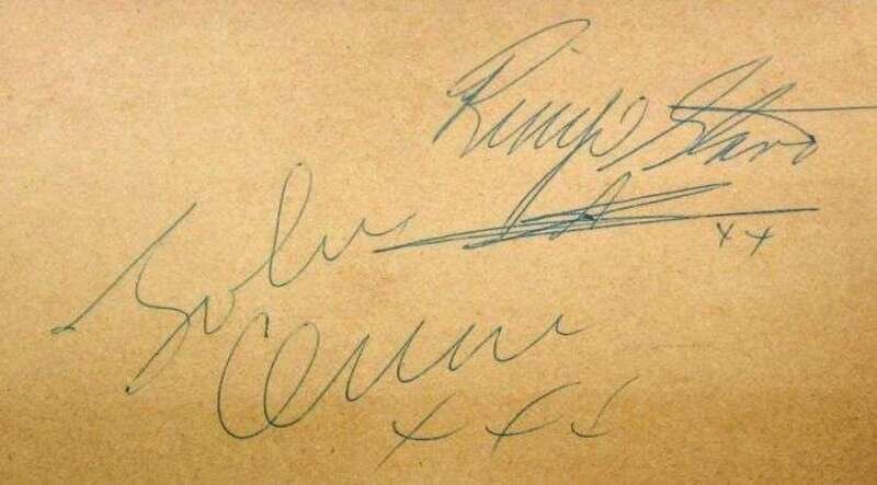 Cut Signatures. Lennon, John; Starr, Ringo. On slightly browned sheet, 3 x 4 1/2 inches (76 x 114 mm). With Steve Hansen LG Ltd Certificate of Authenticity.