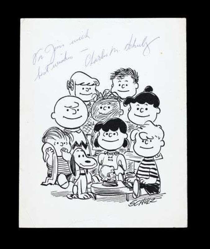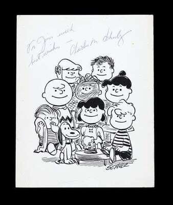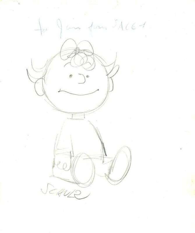 Autograph Material. Schultz, Charles M.: Orig. Pencil Drawing. Signed in pencil, Schultz [Charles M.] "Sally," ca. 1960. 9 1/2 x 7 1/2 inches (240 x 190 mm). Also inscribed in Schultz' hand above image, "for Jim from Sally". * Print Signed and Inscribed by Charles M. Schultz. "The Peanuts Gang," ca. 1960. 10 x 8 inches (254 x 203 mm), on heavy paper stock. Inscribed & signed in full in blue ball point above image.