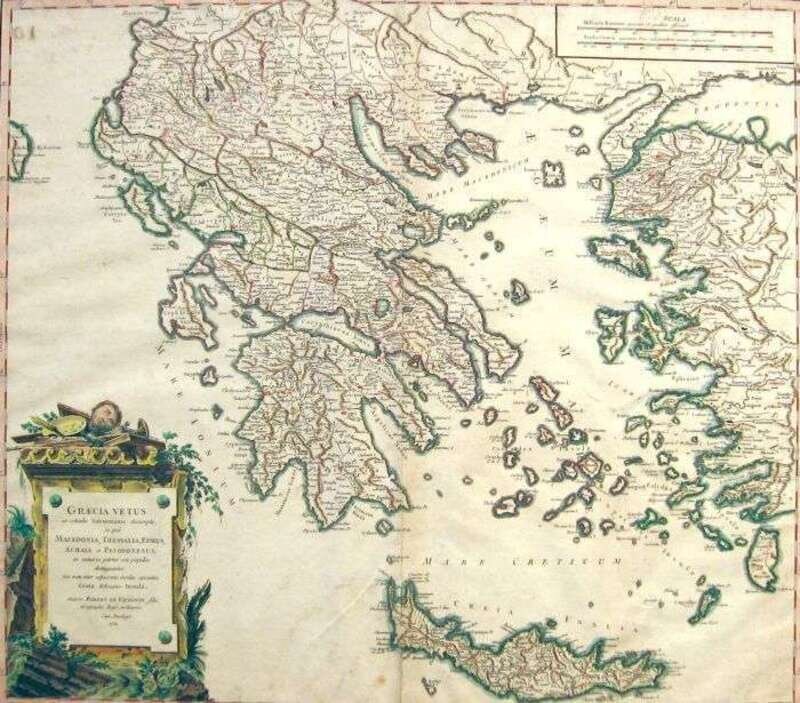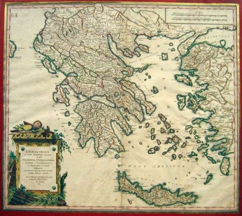 Hand-Colored Engraved Map. De Vaugondy, Robert. "Graecia Vetus..." (Paris), 1752. 19 x 21 1/2 inches (480 x 550 mm). Matted along plate mark, but generally clean. Orig. color.