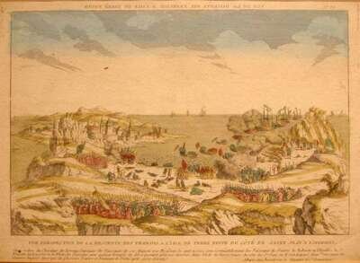 Hand-Colored Engraving - Vue d'Optique. "Vue Perspective de la Descente des Francois a l'Isle de Terre Neuve du Cote de Saint Jean a l'Occident." Paris: Chez Basset, n.d. [ca. 1750]. 11 x 15 1/4 inches (280 x 387 mm). Generally clean. Framed.