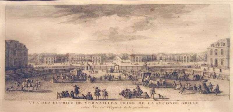 Engraving. Rigaud, Jean. "Vue des Ecuries de Versailles Prise de la Seconde Grille, Cette Vue est l'oposee de la Precedente." [Paris], [ca. 1750]. 9 7/8 x 19 1/8 inches (250 x 485 mm), margins. Light to moderate toning. Framed.