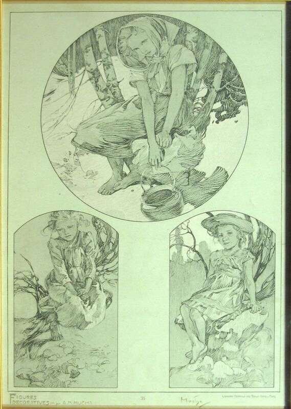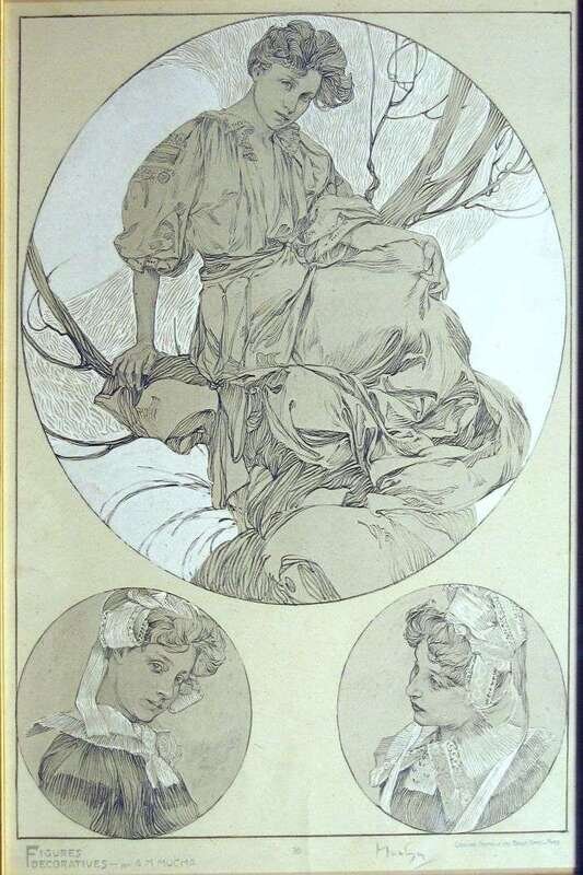 Tinted Lithographic Plates. Mucha, A(lphonse) M. "Figures Decoratives." Plates 35 & 36. [Paris], [ca. 1900]. Folio sheets, approx. 15 1/2 x 11 inches (393 x 280 mm). Clean. Each signed in pencil by Mucha. Framed.