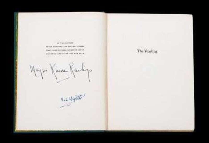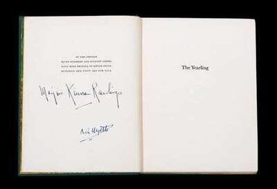 (Wyeth, N.C. illustrator.) Rawlings, Marjorie Kinnan. The Yearling. New York: Charles Scribner's, 1939. First Wyeth edition, 1/770 signed by Rawlings & Wyeth. Large 8vo, orig. gilt-pictorial emerald cloth, gilt-lettered spine, t.e.g., other edges untrimmed; negligable wear, chemise (slightly scuffed), slipcase, (some edge wear, a few joints just starting). Pictorial endpapers, facsimille of Wyeth letter, 2 plain & 14 color plates. Bright attractive copy in slightly worn sleeve & slipcase.