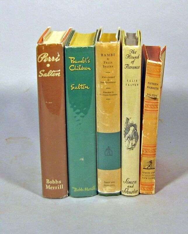 Salten, Felix: Bambi: A Life in The Woods. New York: Simon and Schuster, 1928. 1st Am. ed. & 1st English-language ed. 8vo, orig. green cloth, gilt; gilt-lettered spine, top edge stained yellow; occasionally slightly scuffed, d/j (small tear, minor edge wear). Illus. by Kurt Wiese, foreword by John Galsworthy, translated by Whittaker Chambers. Issued simultaneously with the London ed. * Bambi's Children. Indianapolis: Bobbs-Merrill, (1939). 1st Am. ed. (and 1st ed. in English). 8vo, orig. silver & black stamped green cloth; minor wear, d/j (light edge wear, back panel slightly dusty, price clipped). Illus. Internally clean.* Perri. Indianapolis: Bobbs-Merrill, (1938). 1st Am. ed. (and 1st ed. in English). 8vo, orig. silver & black stamped orange cloth; light wear, d/j (occasional chipping along edges). Illus. by Ludwig H. Jungnickel. * Fifteen Rabbits. New York: Simon & Schuster, 1930. 1st ed., advance review copy. 12mo, orig. stiff wrappers; head of spine detaching, edge wear. Translated by Whittaker Chambers. * The Hound of Florence. New York: Simon & Schuster, 1930. 1st Am. ed. 8vo, orig. yellow cloth; light wear, d/j (minor wear, price clipped). Illus. by Kurt Weise.