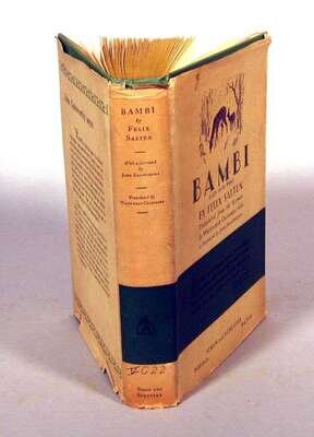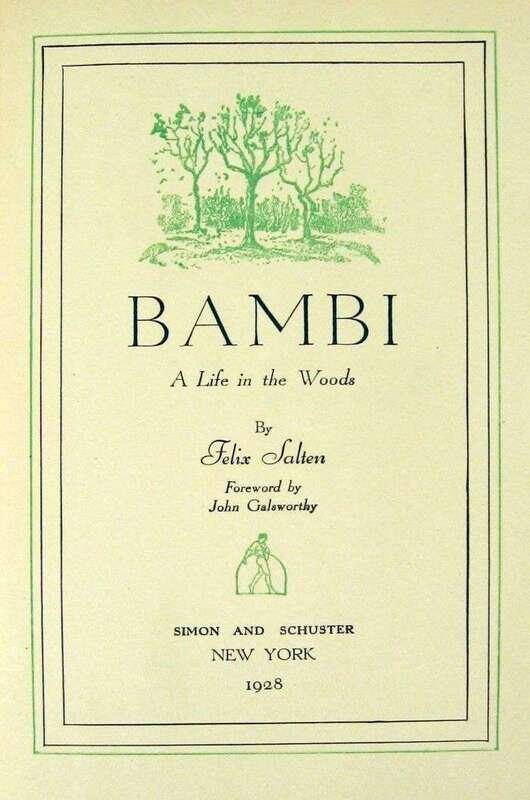 Salten, Felix. Bambi: A Life In The Woods. New York: Simon and Schuster, 1928. First American edition & first English-language edition. 12mo, orig. gilt-pictorial green cloth, top edge stained yellow; minor wear, small private library label on spine, d/j (occasional edge wear, some creasing & small tears, private library ink shelf mark on spine panel). Illus. by Kurt Wiese, foreword by John Galsworthy, translated by Whittaker Chambers. Internally clean. Issue in cloth, without slipcase. VG+