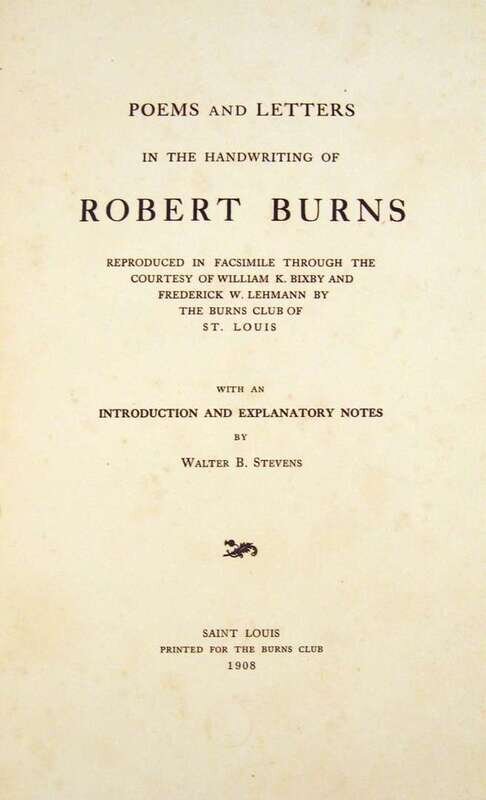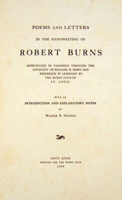 Burns, Robert. Poems and Letters in The Handwriting of... Reproduced in Facsimile... Saint Louis: for The Burns Club, 1908. Edited by Walter B. Stevens. #287/300. Folio, orig. paper vellum & bds.; worn & rubbed, spine gone. Frontis. portrait, facsimile plates. Scattered light foxing.