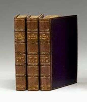 Collins, Wilkie. The Woman In White. New York: Harper & Brothers, 1860. First edition. 8vo, orig. blind-stamped brown cloth, gilt-lettered spine; light edge wear, front hinges stressed , the silver figure of the woman in white at bottom of spine faded. 2 pp adverts., dated Aug. 1860, preceding title-page, 4 pp adverts. at back. Illus. by John McLean. Minor internal creasing. Second (of three) states, differing only in their terminal adverts., with Dinah Mulock's name properly spelled on p. 261.