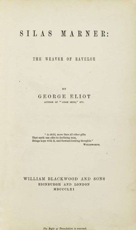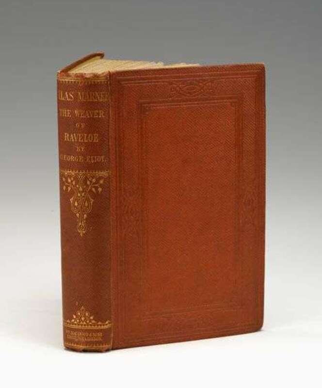 Eliot, George. Silas Marner, The Weaver of Ravole. Edinburgh: William Blackwood & Sons, 1861. First edition, first printing. 8vo, orig. ripple-grained cinnamon cloth, gilt-lettered & decorated spine, untrimmed edges; very minor wear, corners very slightly bumped. With 4 pp of adverts. at front, 11 pp adverts. at back. Book seller's blind stamp on first leaf of front adverts., Burn bindery's ticket on back paste-down. Unopened. Internally clean. In custom 1/4 red morocco & cloth slipcase, with chemise, richly gilt spine.
