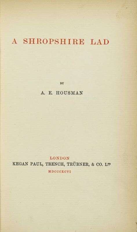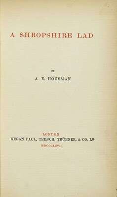 Housman, A.E. A Shropshire Lad. London: Kegan Paul, Trench, Trubner, 1896. First edition, first state. Small 8vo, orig. 1/4 vellum & gray-blue bds; paper spine label, edges untrimmed; extremities discolored. Internally clean. Complete with 1/2 title. With the word "Shropshire" on paper spine label 33 mm wide. With 2 bookplates on front paste-down, incl. Rockwell Kent designed Frederick Baldwin Adams, Jr. book plate. In custom 1/2 morocco & cloth slipcase with red cloth chemise. Presentation copy from Louise Guiney to Rev. William H. Van Allen of Boston. Guiney had writted an enthusuastic (and unsolicited) review of the work for the Chap-Book.