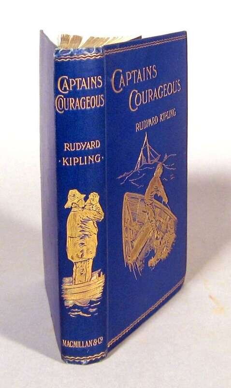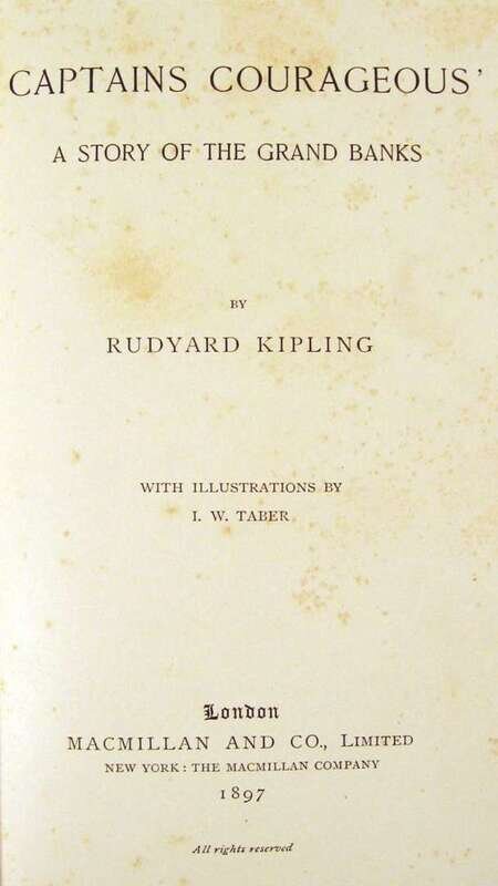 Kipling, Rudyard. Captains Courageous. A Story of The Grand Banks. London: Macmillan, 1897. First edition. 8vo, orig. gilt-lettered & pictorial blue cloth, gilt-pictorial spine; occasionaly slightly scuffed, very slightly cocked. Illus. by I.W. Taber, frontis., text illus. Complete with 1/2 title & 2 pp adverts. at back. Back free endpaper creased, scattered, generally light, foxing. Bright copy.