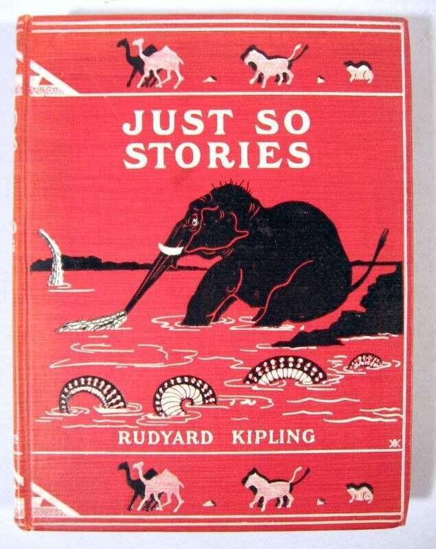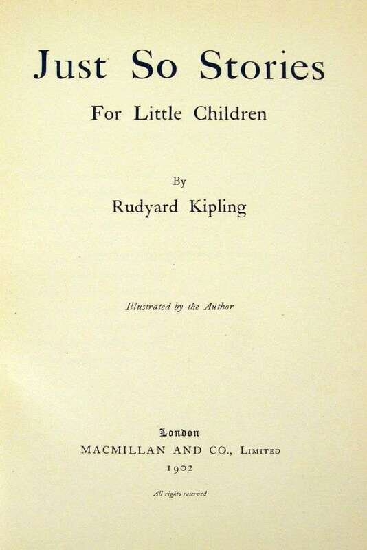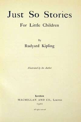 Kipling, Rudyard. Just So Stories, for Little Children. London: Macmillan, 1902. First edition. 4to, orig. black & white stamped pictorial cloth; light wear, corners slightly bumped, spine ends very slightly worn. Full-page & other illus. by the author; light to occasionally moderate foxing to endpapers & blanks, other scattered minor spotting. Attractive copy.