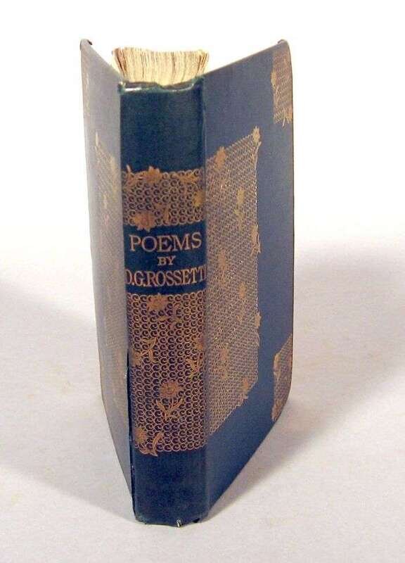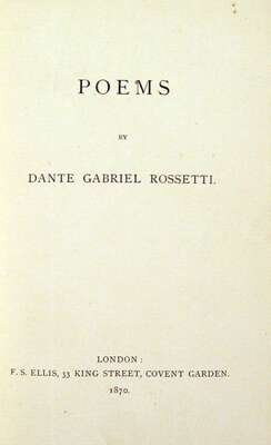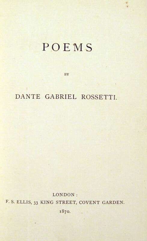 Rossetti, Dante Gabriel. Poems. London: F.S. Ellis, 1870. First published edition. 8vo, orig. gilt floral & circular decorated blue green cloth, gilt-lettered & decorated spine; edges untrimmed; corners slightly bumped, minor edge wear. Floral decorated endpapers. Early owner's ink signature at head of title-page, pencil annotations on verso of dedication page & head of first contents page, otherwise internally clean. 4 pp adverts. Bright, attractive copy.