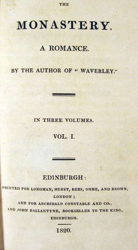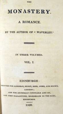 (Scott, Sir Walter.) The Monastery. Edinburgh, 1820. First edition. 12mo, contemp. 1/2 brown calf & marbled bds.; rubbed & worn, morocco spine labels (1 gone). Slightly trimmed. Internally generally clean.