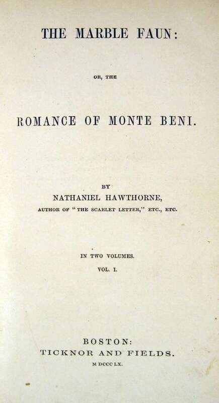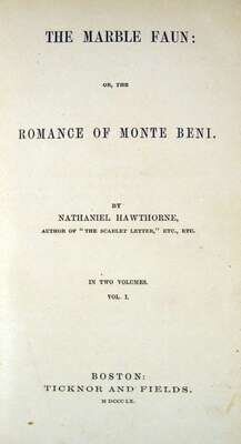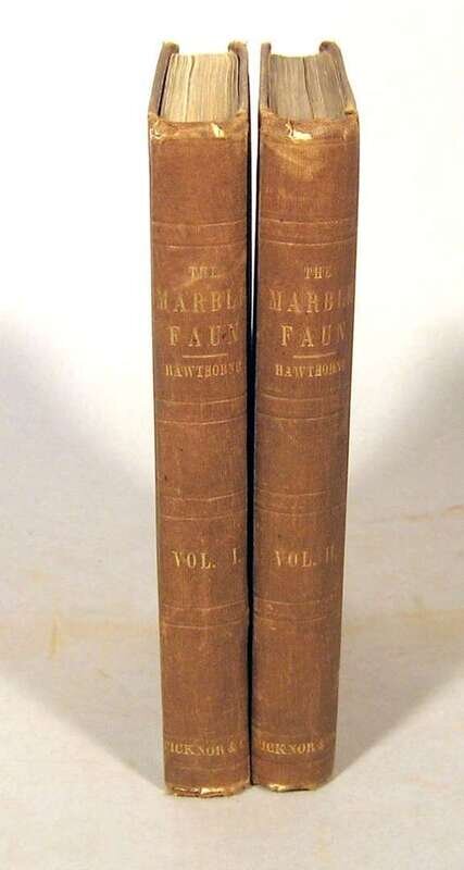 Hawthorne, Nathaniel. The Marble Faun. Boston: Ticknor and Fields, 1860. First American edition, presumed first issue. 12mo, orig. blind stamped brown cloth, gilt-lettered spine; corners bumped, light edge wear, spine ends slightly chipped, very slightly cocked. In custom morocco & cloth slipcase with with cloth chemise. With 16 pp pub. cat., dated March, 1860, at rear of vol 1. Complete with 1/2 titles. Internally generally clean, some light foxing to pub. cat.