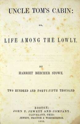 Stowe, Harriet Beecher. A Key to Uncle Tom's Cabin. Boston: J.P. Jewett, 1853. First edition, second printing. 8vo, orig. 1/2 morocco & cloth, gilt-lettered spine; scuffed, joints & extremities rubbed, casing coming loose. Lacking adverts. Bound with the 285th Thousand of Uncle Tom's Cabin, Boston, 1853.