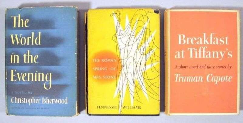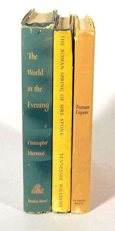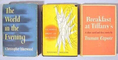 Modern First Editions: Capote, Truman. Breakfast at Tiffany's. New York: Random House, (1958). 1st ed. 8vo, orig. yellow cloth; moderate spotting & dust soiling, d/j (minor chipping to edges, slightly dusty). Moderate darkening & dust soiling to endpapers. * Isherwood, Christopher. The World In The Evening. New York: Random House, (1954). 1st ed. 8vo, orig. cloth & bds.; corners bumped, d/j (chipping along edges). Moderate darkening & dust soiling to endpapers. * Williams, Tennessee. The Roman Spring of Mrs. Stone. (New York): New Directions, (1950). 1st trade ed. 8vo, orig. yellow-stamped black cloth; light wear, d/j (corners chipped away, joint of front panel split). Moderate to occasionally heavy dust soiling & darkening to endpapers.