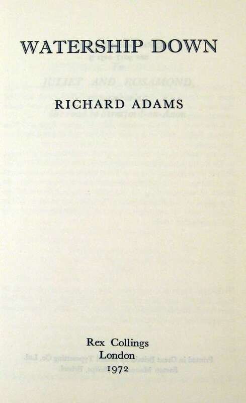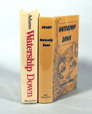 Adams, Richard. Watership Down. London: Rex Collings, 1972. First edition. 8vo, orig. gilt-pictorial brown cloth; minor wear, d/j(occasional minor creasing at edge). NF/NF+. * The first American edition of the preceding. 8vo, orig. cloth & bds, d/j; minor wear NF/NF+. Bright copy.