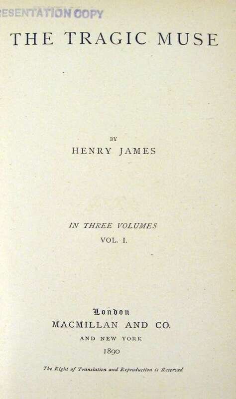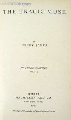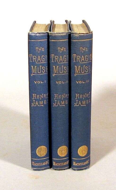 Henry, James. The Tragic Muse. London: Macmillan, 1890. First edition. 8vo, orig. gilt-lettered blue cloth; light edges wear corner slightly bumped, very slightly cocked. Hinges of vol.1 stressed, back hinge of vol. 2 starting. Internally clean. With the book plate of the noted collector John Quinn on front paste-down. Bright set of the last of James' works to be issued as a triple decker.