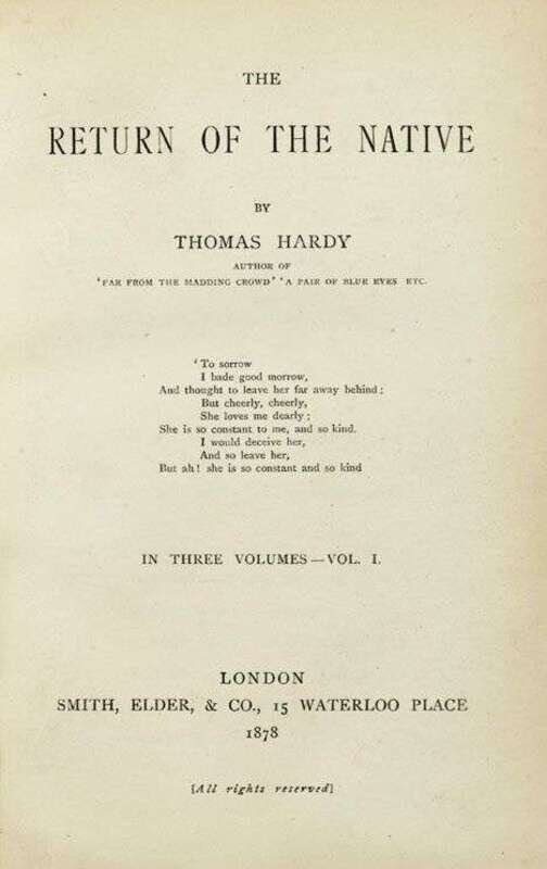 Hardy, Thomas. The Return of The Native. London: Smith, Elder & Co., 1878. First edition in book form, first issue. 8vo, slightly later 3/4 crushed brown levant morocco, gilt, gilt-lettered, floral-paneled spine, t.e.g., other edges untrimmed; extremities occasionally scuffed, by Bayntun. With frontis. map in vol. 1, 2 pp adverts. at end of vol. 2. Complete with all 1/2 titles & blanks. Expert repair to head of vol. 1 1/2 title. Internally crisp & clean.