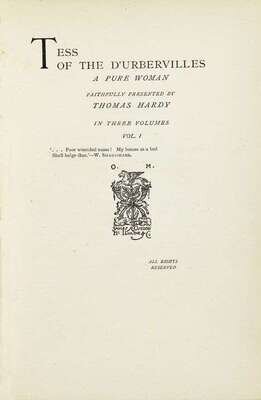 Hardy, Thomas. Tess of The D'Urbervilles: A Pure Woman. (London): James R. Osgood, (1891). First edition in book form, first issue. 8vo, orig. gilt-decorated tan cloth; corners bumped, scuffed & moderately worn, very slightly dusty, spine edges slightly frayed, front hinge of vol. 1 & back hinge of vol. 3 slightly stressed. Some foxing & discoloration to endpapers, other scattered minor spotting. Complete with all 1/2 titles & blanks. In custom orange cloth case.