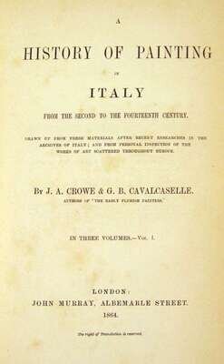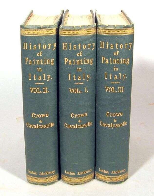 Crowe, J.A. A History of Painting in Italy, from The Second to The Fourteenth Century. London: John Murray, 1864. First edition. 8vo, orig. green cloth, gilt, gilt-lettered spines, edges untrimmed; some edge wear, spine ends slightly frayed. With 99 plates. Complete. Internally generally clean. Partly unopened. Title page of vol. 3 loose.