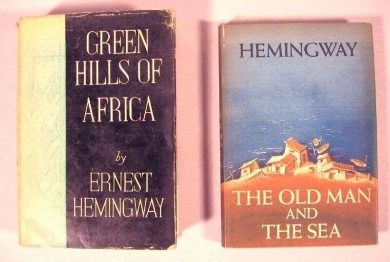 Hemingway, Ernest: Green Hills of Africa. New York: Scribner's, 1935. 1st ed. 8vo, orig. gilt-lettered green cloth; spine discolored, fading to corners, d/j (occasional chipping to edges - no loss of lettering, some spotting & dust soiling, verso rather browned). Moderate browning & dust soiling to endpapers. Internally slightly browned. Hanneman A13a. * The Old Man And The Sea. New York: Scribner's, 1952. 1st trade ed. 8vo, orig. blue cloth; some spotting & minor dust soiling to extremities, d/j (slightly dusty, extremities a little discolored). Some dust soiling & discoloration to endpapers. First state d/j with blue Hemingway face. Hanneman A24a.