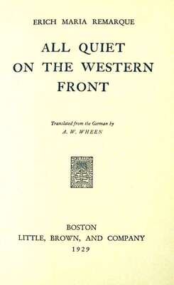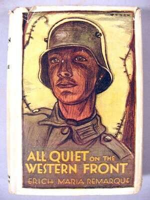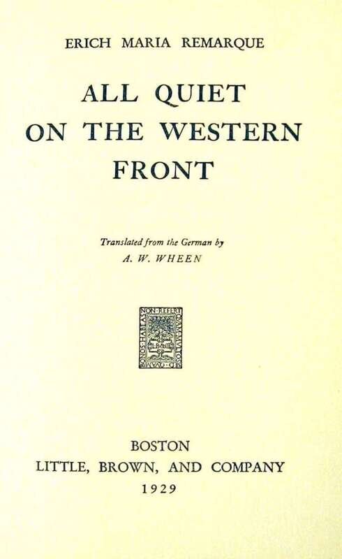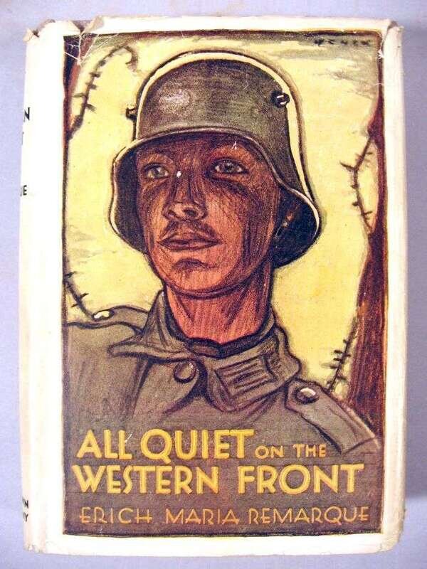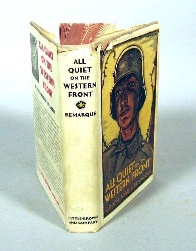 Remarque, Erich Maria. All Quiet on The Western Front. Boston: Brown, Little, Brown, 1929. First American edition, first printing. 12mo, orig. grey cloth; light edge wear, small private library label on spine, d/j (some edge wear, occasional, mostly minor, chipping to edges, minor creasing). Creasing & tears at heads of pp. 89-94 - negligible paper loss.