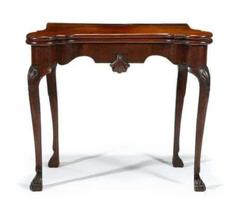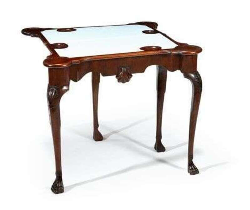The shaped top with rounded forecorners opening to a baize inset playing surface with dishes for chips above a plain frieze centered by a carved shell raised on cabriole legs carved at the knees with shells and ending in stylized Spanish paw feet.