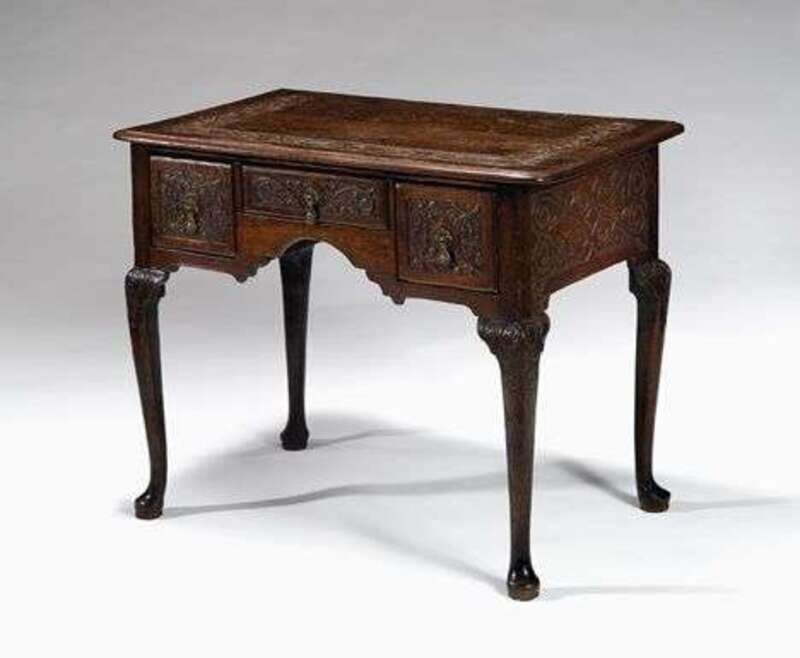 The rectangular top with a blind fretwork band of scrolls above a short drawer and two deep drawers carved with oak leaves, raised on round tapered legs ending in pad feet and carved at the knees with scrolls.