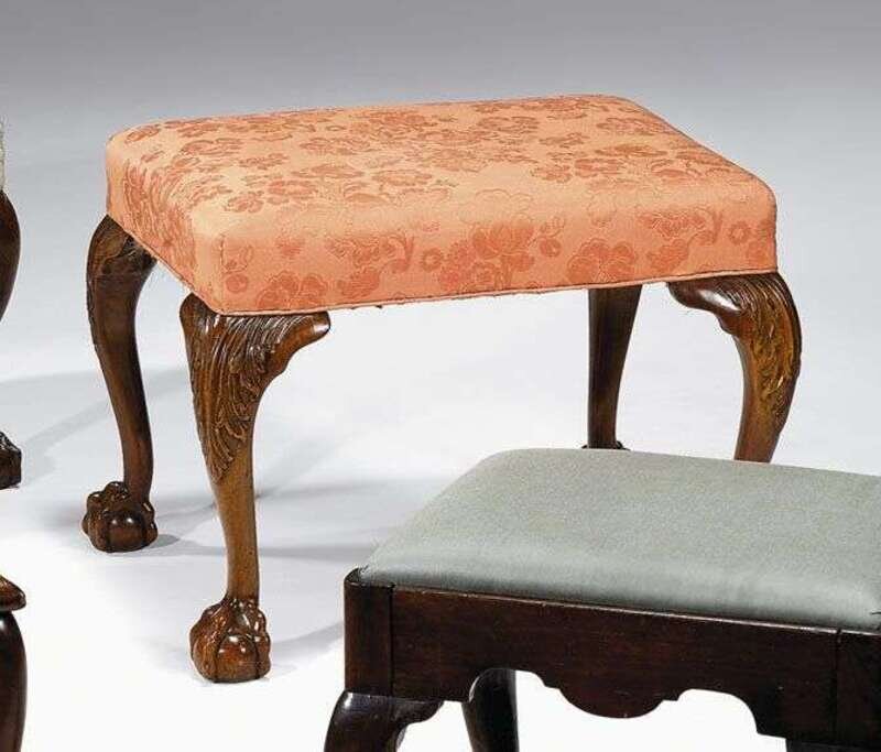 The padded rectangular top raised on acanthus carved cabriole legs ending in ball and claw feet.