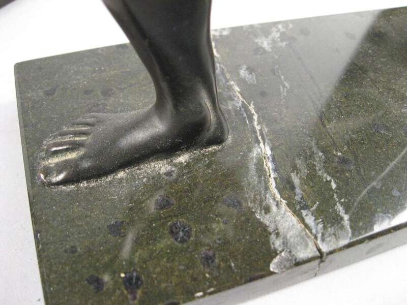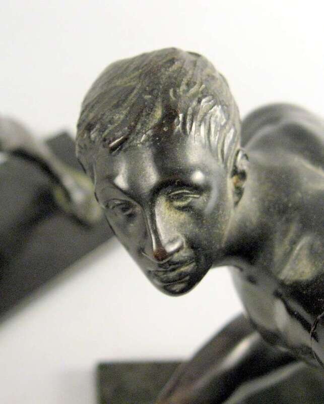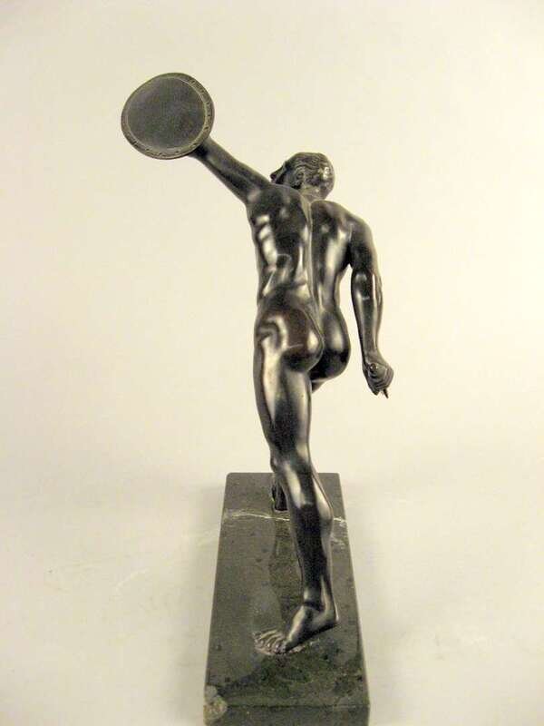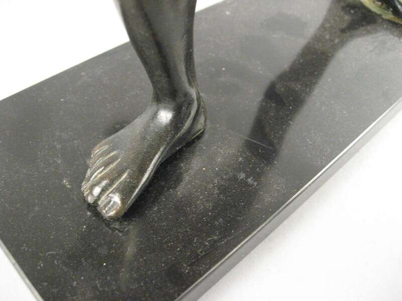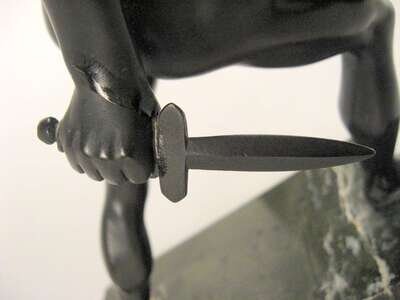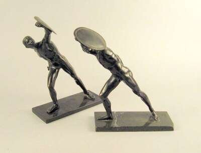 Dark brown patina, both with shield, one example with sword, on marble bases. (2).