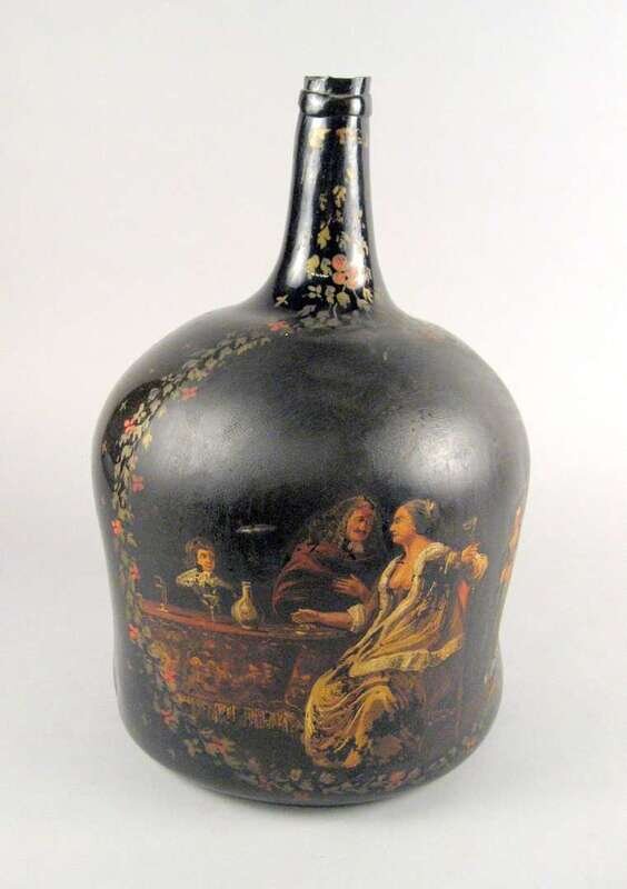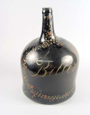 The bulbous brown glass bottle painted with an interior scene of a domestic scene, the reverse inscribed 'Bitter'.