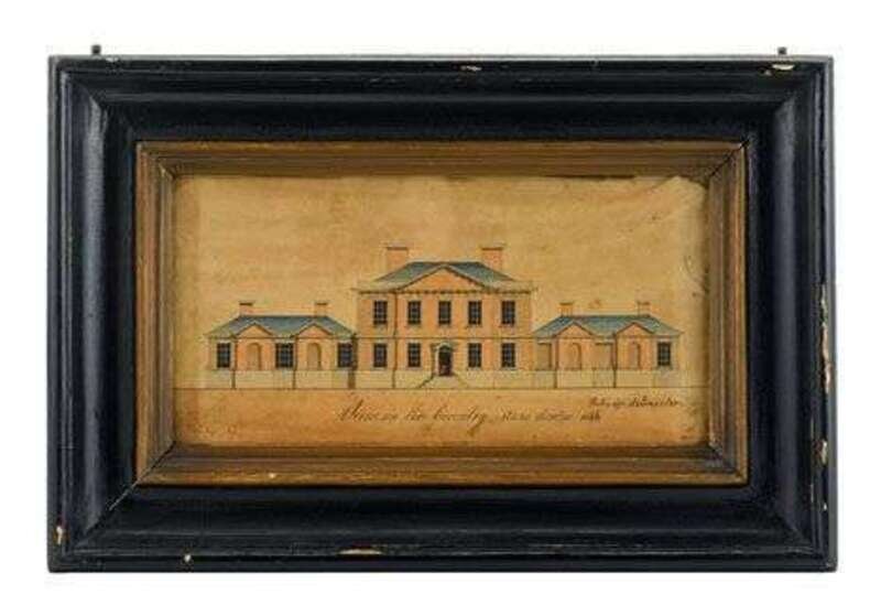 Watercolor and ink on paper, depicting a two story Georgian country house with two wing extensions, inscribed 'View in the Country/ Anno domini 1816' and signed 'R. Knight delineater'; in a molded ebonized and gilt frame.