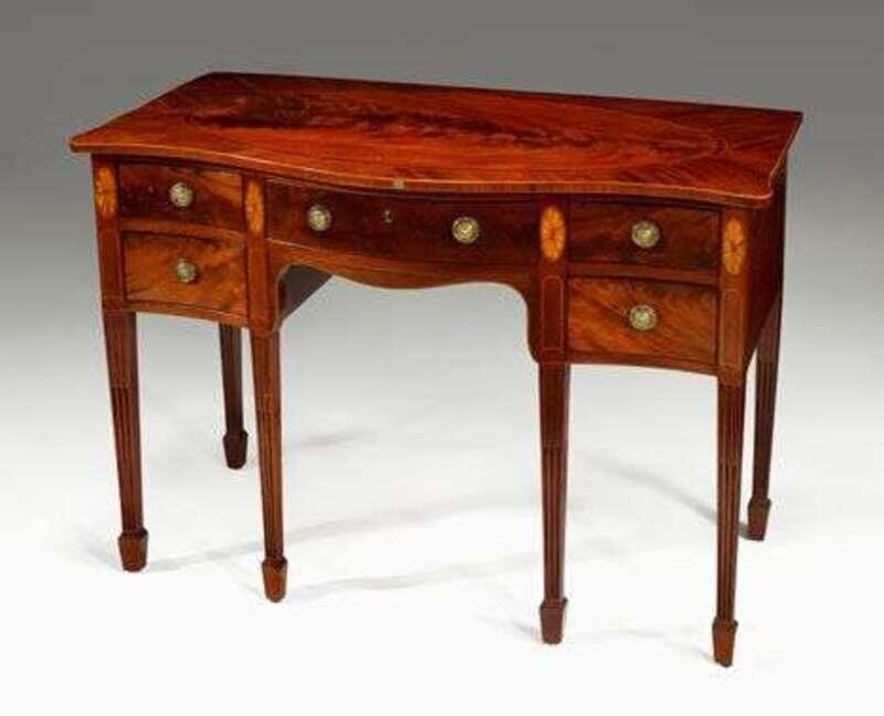 The serpentine outline top with an oval flame mahogany panel, over a single short drawer flanked by two banks of short drawers separated by inlaid fan medallions, raised on tapered square stop-fluted legs ending in spade feet.