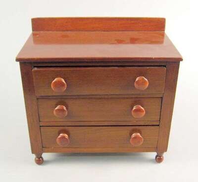 The rectangular molded top above three graduated drawers with wooden knobs, over a shaped apron and curved bracket feet.