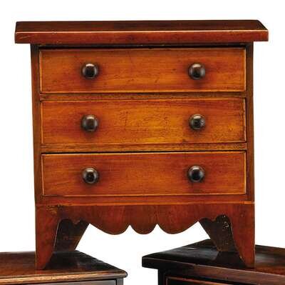 The rectangular top with a raised back over three long drawers with wood knobs, raised on short turned legs.