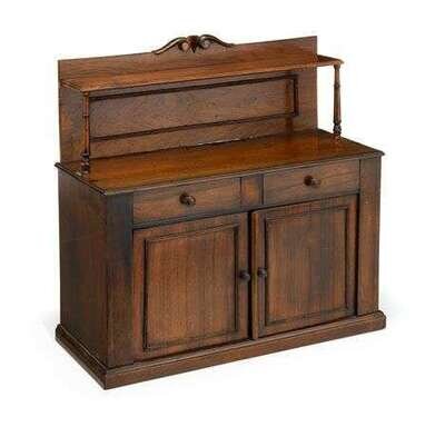 The superstructure with a carved scroll crest and single shelf raised on turned supports; over two short drawers above a pair of cupboard doors on a molded plinth base.