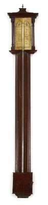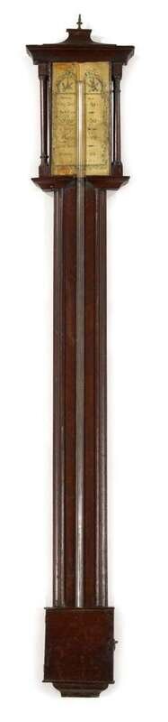 The molded cornice with raised finial over a printed scale flanked by doric columns, above a straight case and square cases reservoir,.