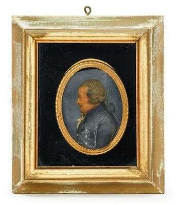Oval, profile portrait depicting an older gentleman wearing a blue coat, his hair tied with a ribbon, framed and mounted in a later shadow box frame.