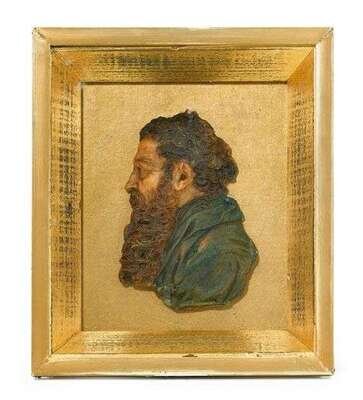 Profile portrait to the right, mounted in a giltwood shadow box frame.