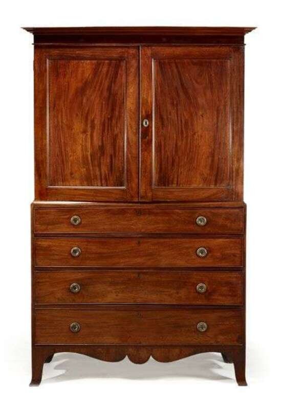 The molded cornice above two cabinet doors opening to a shelved interior; the lower section with four graduated long drawers, raised on splayed feet.