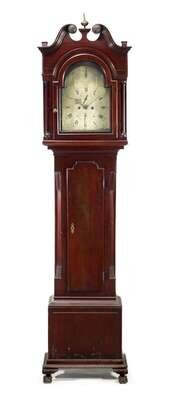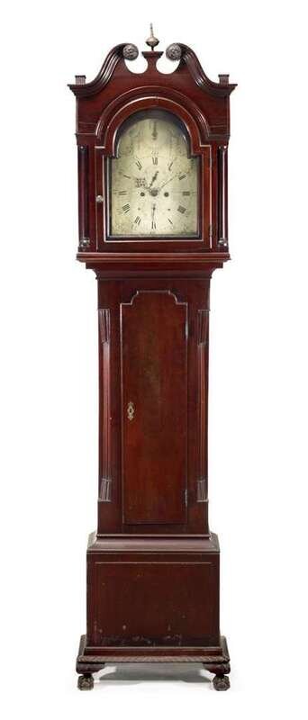 The dial with Roman numerals signed David Samuel and Son London, the case having a broken arch pediment, carved sunflower rosettes, the door flanked by reeded quarter columns, on ball and claw feet.