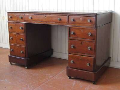 The rectangular top with an inset green leather writing surface, over two pedestal supports with drawers.
