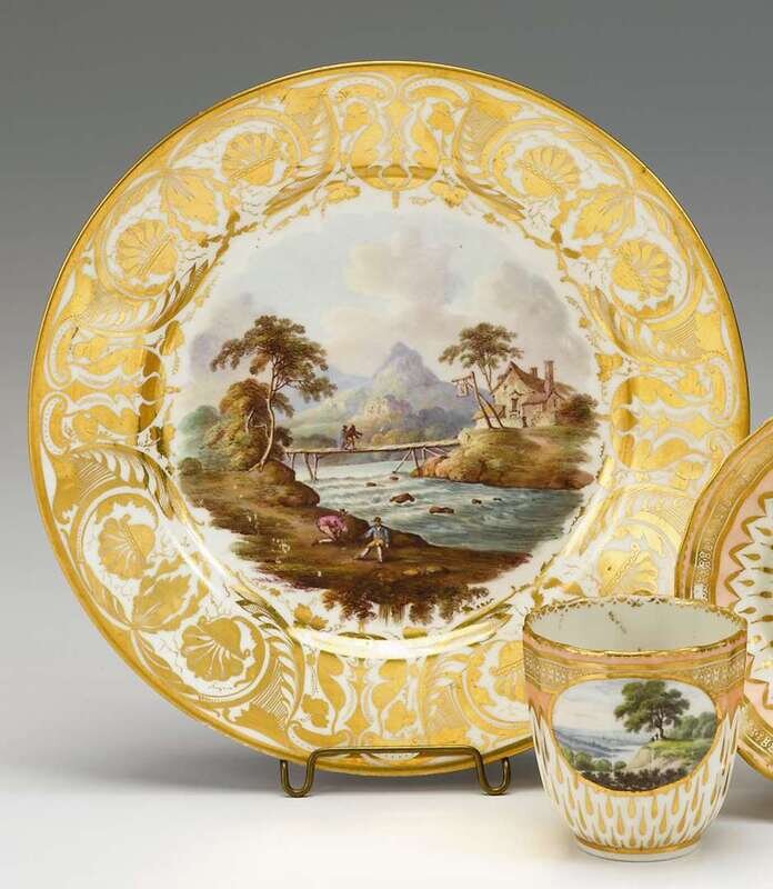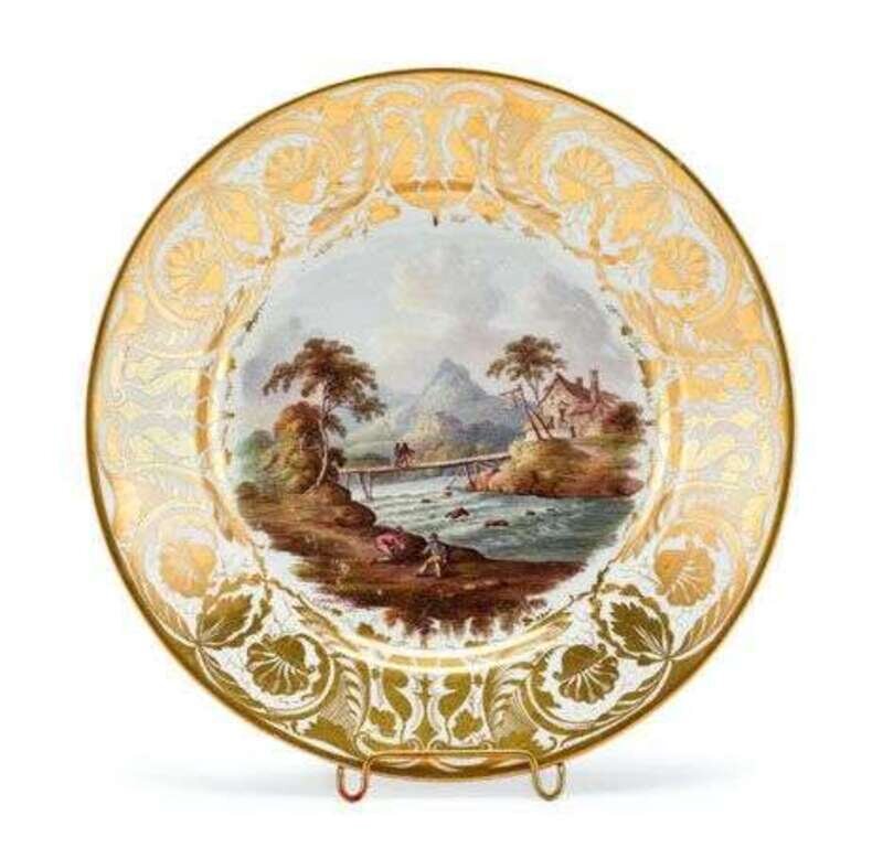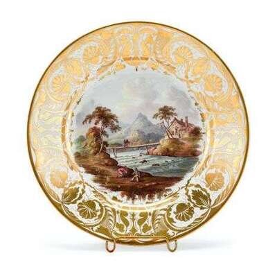 Centrally painted with a country view of figures crossing a bridge to an inn, within a scrolling wide gilt border, inscribed on the reverse 'In Scotland', red marks.