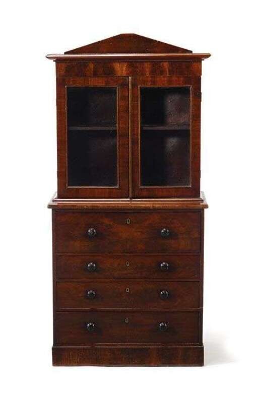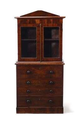 The triangular pediment over two glazed doors opening to shelves above four graduated drawers raised on a plinth base.