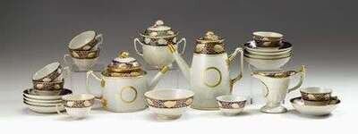 Comprising a teapot, coffeepot, cream jug, covered sugar bowl, waste bowl, six teacups, three tea bowls, and ten saucers, all with cobalt and gilt decorated bands.