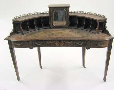 The leather top surmounted by a center mirrored cabinet flanked by four open vertical shelves, putti surrounded by scroll marquetry on the top, the central drawer frieze with two faux drawers and one center drawer ornamented with scrolls and griffins on tapered string inlay legs.